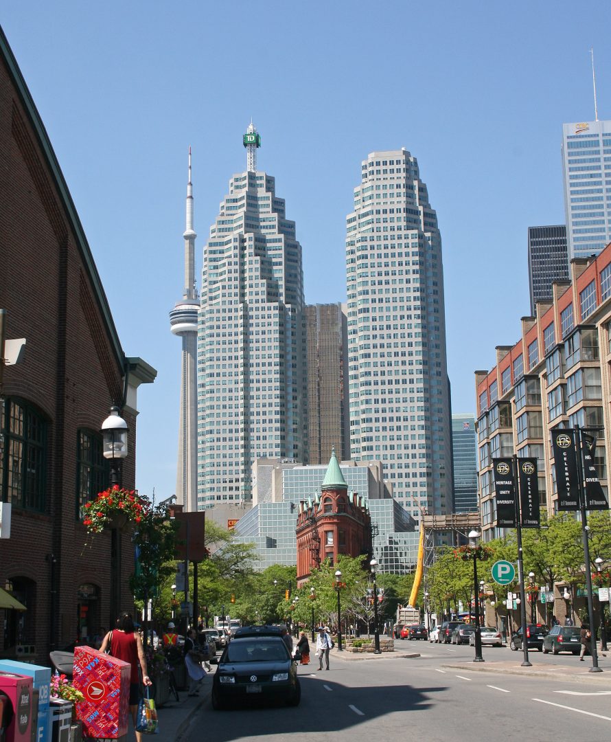 Tää toveri on sinänsä kätevä maamerkki, että kaupunki on rakennettu helposti navigoitavaks ilmansuuntien mukaan. Jos kysyy reittiohjeita, kukaan paikallinen ei neuvo kääntymään oikeaan tai vasempaan vaan puhuu etelästä, pohjosesta, idästä ja lännestä. Etelässä on torni ja järvenranta. University of Toronton kampus eli U of T taas on downtownin pohjososassa eli jos halutaan meijän kämpiltä CN Towerille, kävellään etelään ja sit pikkasen itään. Downtown puolestaan jakautuu useisiin kaupunginosiin tai ”kyliin”, ja lisäks on olemassa Midtown, Uptown ja sit kaikenlaisia muita lännessä ja idässä olevia kauempia alueita. Asuuhan täällä metropolialueella yli Suomen väkiluvun verran ihmisiä.