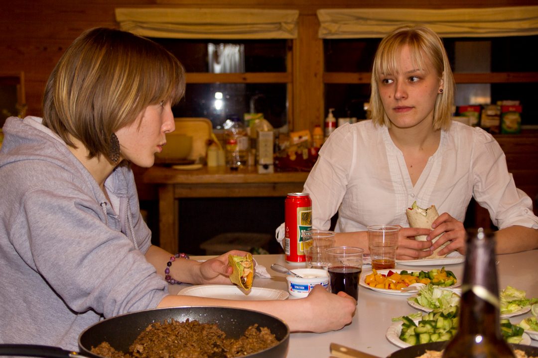 Lopulta saatiin loput tytöt paikalle ja ilta alkoi kunnolla. Lotta ja Maarit kantoivat ämpärikaupalla vettä avannosta, Terhi ja Veronica laittoivat ruokaa ja juorusivat, Ville siirsi taas autoja ja lämmitti saunan. Maarit ja Ville esittelivät tanssimuuvssejaan. Syötiin tortilloja ja tacoja, mutta jälkiruoka puuttui. Kauppakeikan tulos oli siis jäänyt turhan tervehenkiseksi, mutta pääruoka maistui. Saunasta rynnättiin lumeen kierimään ja oli ihanaa. Loppuilta puhuttiin hölmöjä ja filosofisia.