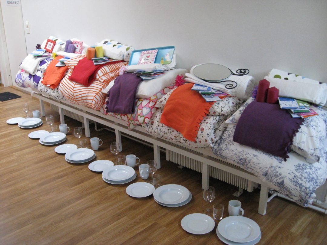Ostimme peitot, tyynyt, vuodevaatteet, huovat, pyyhkeet, pieniä sisustusesineitä, astiastot, aterimet, kattilat, pannut, leikkuulaudat, muovipurkit sekä tietysti jotakin hauskaa ylimääräistä!