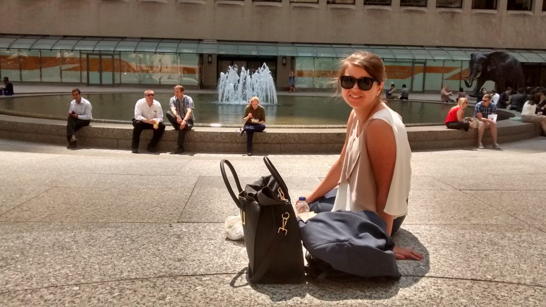 Koska lounas on mun lempihetkiä aamupalan, päivällisen ja iltapalan lisäksi, niin pyhitän sille oman kappaleen. Täällä on aika lailla tapana natustaa jotain lounasta omalla työpisteellä koneen ääressä. Tai keittiössä, jossa voi seurata samalla TV-visoja kollegojen kanssa. Lounaaks syödään joko jotain kotona kokattua, muovipurkeissa tuotua (aika perus) tai käydään alakerran metrotunnelista hakemassa take out. Vaihtoehtoja riittää kreikkalaisesta thaihin ja perus subiin, johon välillä budjettisyistä turvaudun mäkin. Lounasta saa n. 7 eurolla. Mun lemppari on yks thaipaikka, jonka annos on niin iso, että siitä riittää kahdeks päiväks. Pihi-Marianne kiittää! Toistaseks en oo jaksanu kertaakaan kokata ittelleni mukaan lounasta. Pari kertaa oon syöny lounasta työpisteellä, pitihän sitäki kokeilla, mut siinähän vaan sotkee näppiksen ja kaiken! Jos on hyvä sää, niin meen yleensä ulos syömään johonki puiston kulmaan. Työpaikan lähellä on pari hyvää aurinkoista paikkaa, niin saa päivän D-vitamiinitki imettyä siinä samalla 🙂