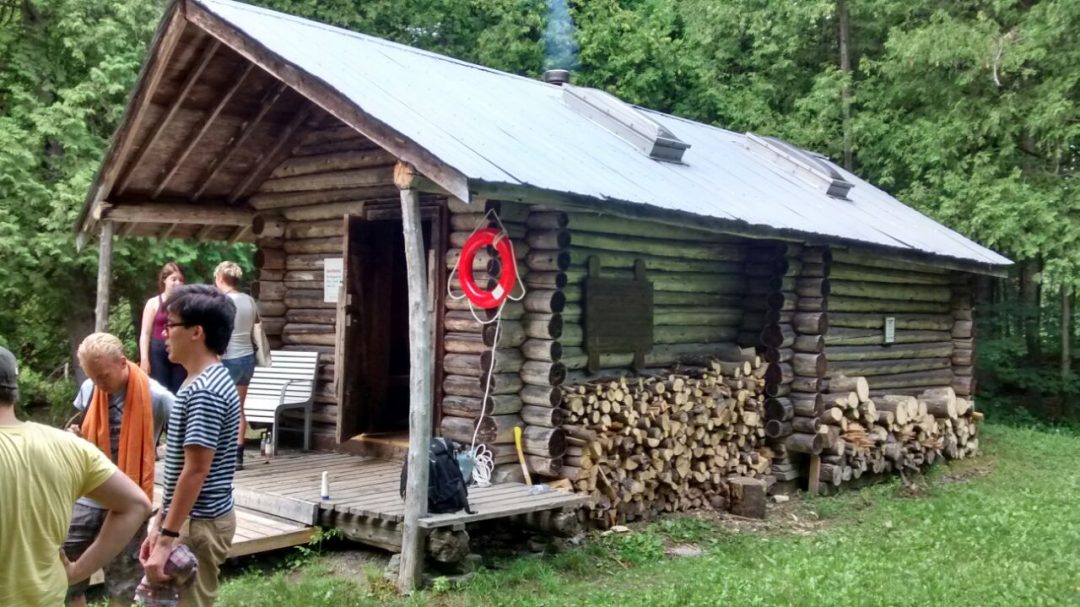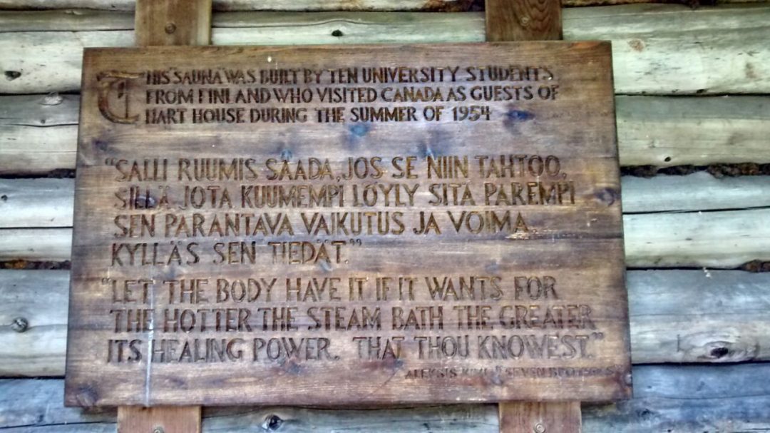 18. heinäkuuta 2015: Lähes 30 asteen paahtavassa helteessä saunan lauteilla istuu 19. suomalaisryhmä nauttimassa löylyistä. Lammessa uidessa pyhkeet heitetään edellisen ryhmän lahjoittamalle penkille.