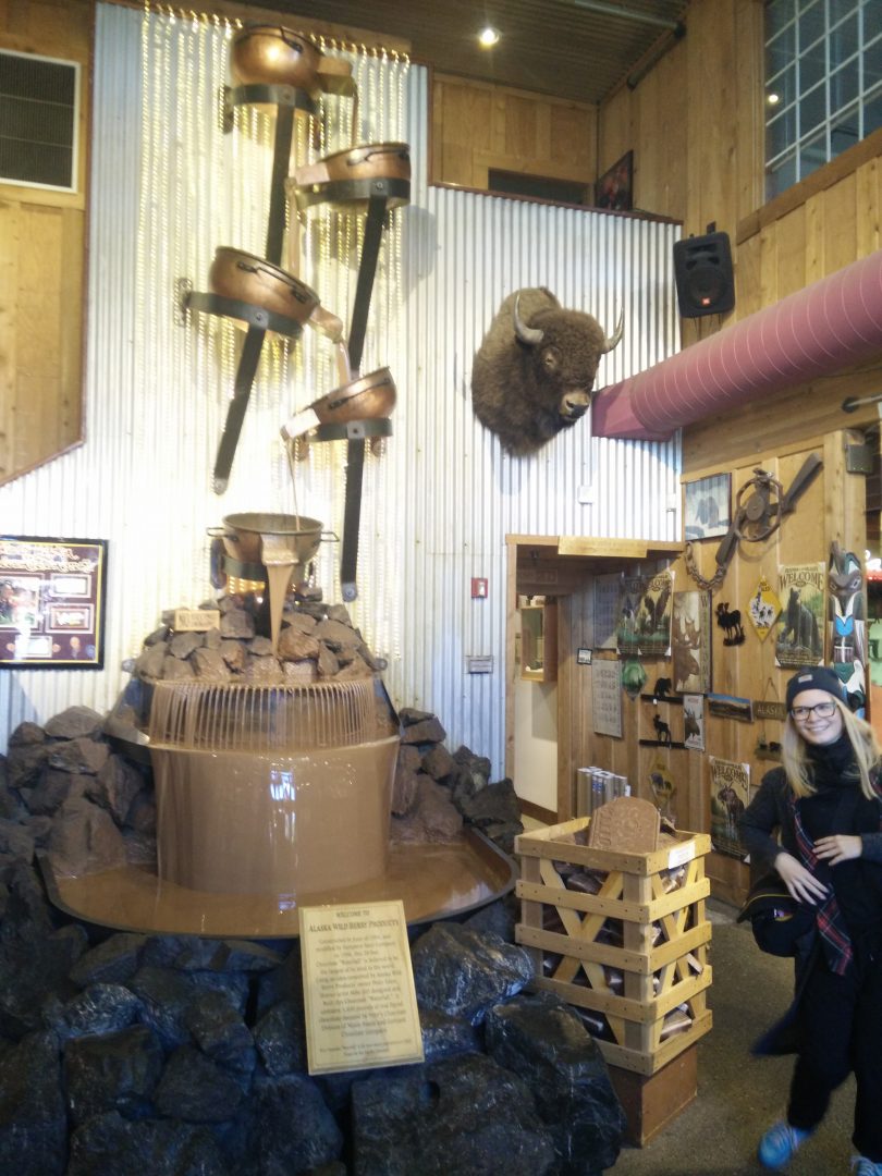 Kun neljän hengen reissuporukkamme oli viettänyt Alaskassa viikon, ja matka oli tuonut meidät Denalin kansallispuiston, Fairbanksin ja Glennallenin kautta takaisin Anchorageen, Mariannen oli aika palata hetkeksi Suomeen. Lentokenttäkeikan ja jäähyväisten jälkeen ei kuitenkaan ollut syytä jäädä liikaa murehtimaan väen vähenemistä, vaan lähdimme katsomaan tiettävästi maailman korkeinta suklaaputousta Alaska Wild Berry Productsin suklaatehtaalle, joka tarjoaa lyhyitä ilmaisia tehdaskierroksia ja tietenkin maistiaisia.