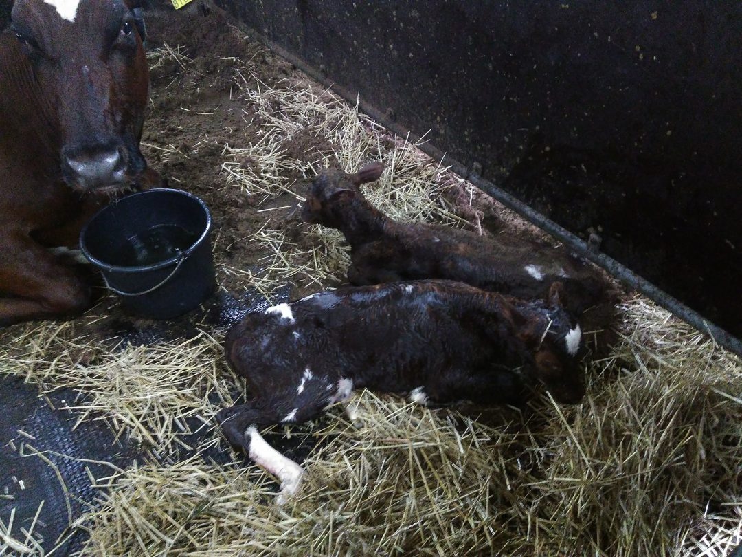 Around 9:45 somebody noticed something coming out of the cow and called the rest of us over. 9:55am, the first calf’s head + upper limbs came through. 3o minutes later, her sister plops right out as well. All in all, very smooth, zero stress, easy birth. I got the firstborn’s birth on tape, and I got to name the twins, so they’re quite special in my eyes.